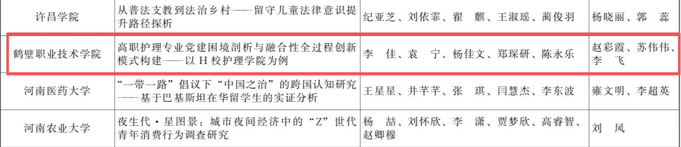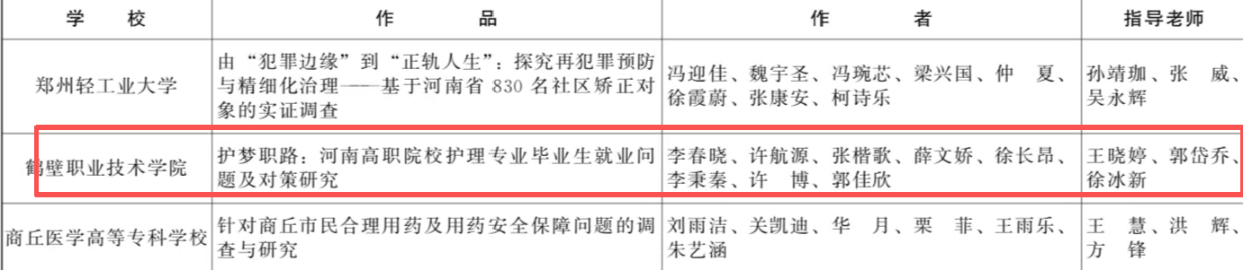 近日,由共青团河南省委、省教育厅、省社科院、省科协、省学联共同主办的第十七届“挑战杯”河南省大学生课外学术科技作品竞赛获奖名单揭晓,护理学院共荣获13个奖项,其中一等奖3项、二等奖1项、三等奖9项。