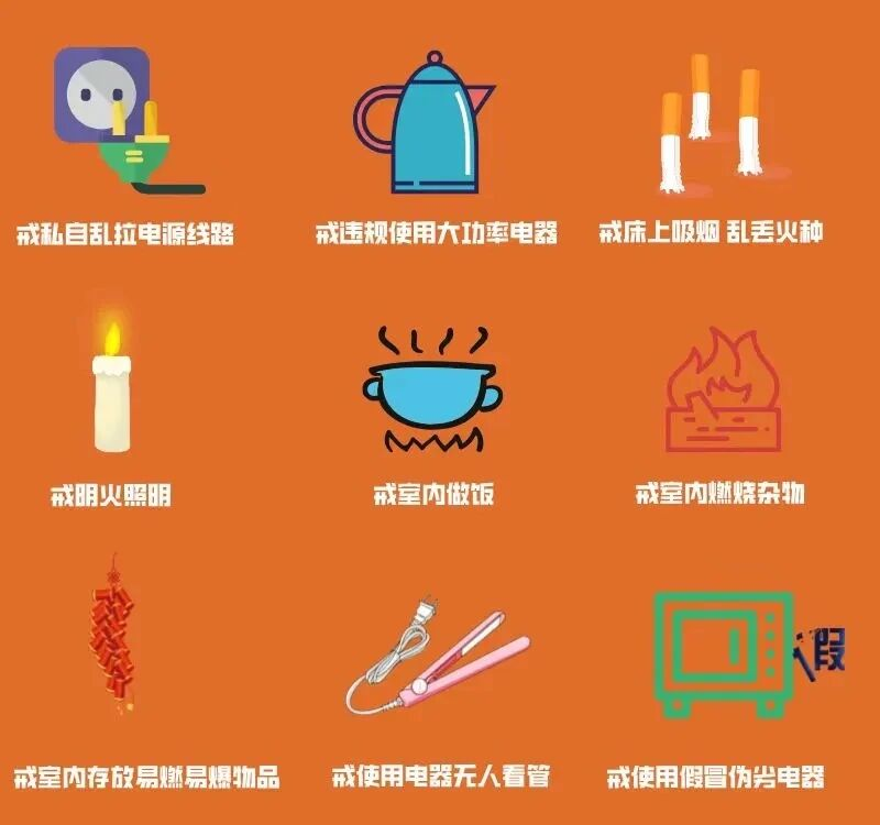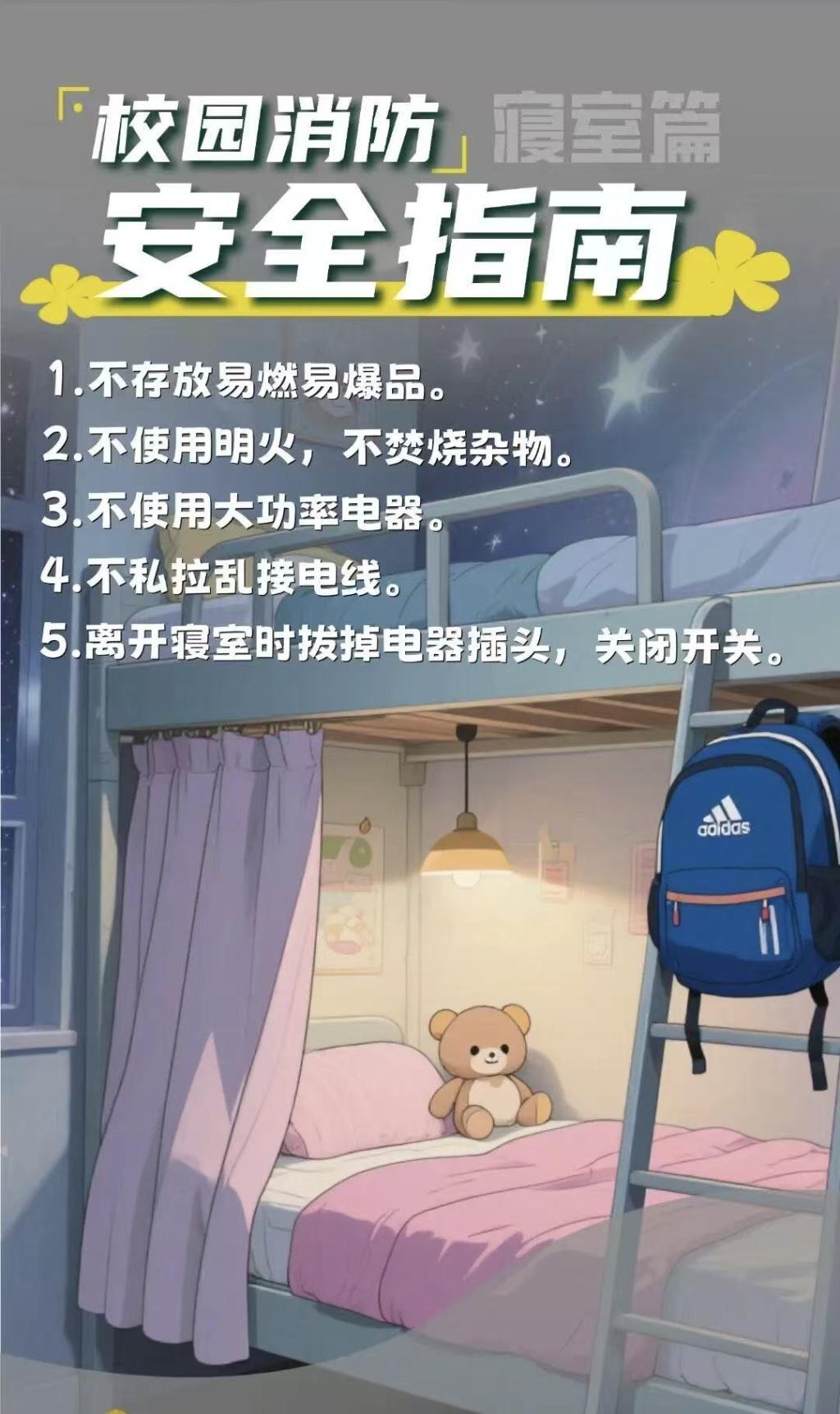 学生宿舍是学校防火的重点区域。通常,生活用火、违规电器等是引发学生宿舍火灾的主要因素。同学们要注意以下四点: