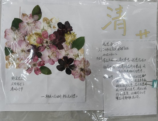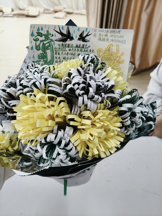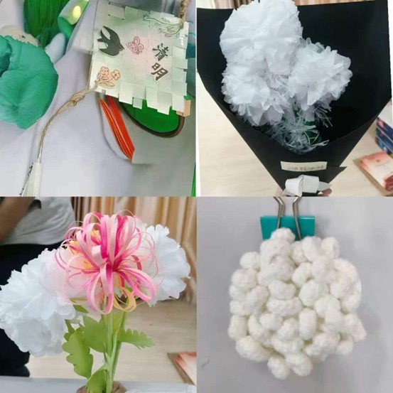 活动现场庄重温馨,学子们踊跃参与,巧用彩纸、黏土、柳枝、丝线等材料全心创作。大家发挥巧思,精心雕琢细节:或折叠素雅纸花、制作清明菊束,以纯粹造型寄托追思;或编织中国结,融合传统习俗与手工巧思,祈愿平安顺遂,更将革命先烈英勇事迹与清明文化定格其中,彰显家国情怀。