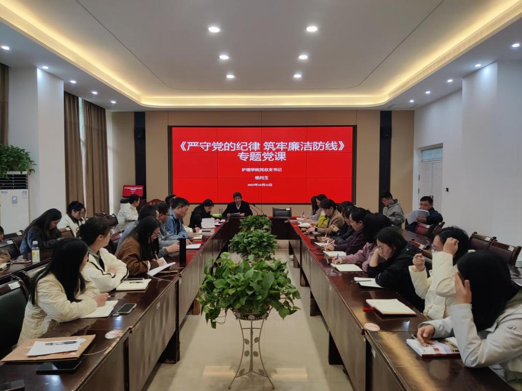 2025年10月22日,护理学院在诚信4号楼B317会议室召开党员廉政学习会,护理学院党总支书记杨尚玉以“严守党的纪律,筑牢廉洁防线”为题给全体党员讲授专题党课,深入落实全面从严治党要求,推动党纪教育融入学院教育教学全过程。