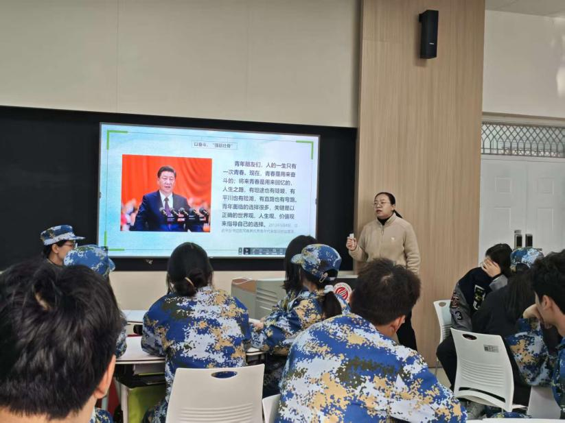 党课围绕“以奋斗强筋壮骨”“以立志培根铸魂”“以乐学固本培元”“以追梦充盈血脉”四大板块展开,既有理论高度,又有实践指导,为青年学生成长成才与追求信仰指明方向。以习近平总书记关于青年成长的重要论述为引领,结合历史与现实讲解:回顾五四运动历程、解读五四精神,分享鲁迅以文字唤醒民众、毛泽东主编《湘江评论》等先辈故事,让学生领会奋斗是青春永恒主题;同时结合大学生成长特点,从大一适应积累、大二规划抉择到大三实习备考,指导学生扣好价值观“第一粒扣子”,并以悬梁刺股典故与部分学生荒废时光现象对比,强调勤学善思的重要性。党课最后聚焦“追梦”与“使命”,阐释中国梦内涵,明确“个人梦”需以“中国梦”为根基,鼓励学生在民族复兴实践中实现个人理想。