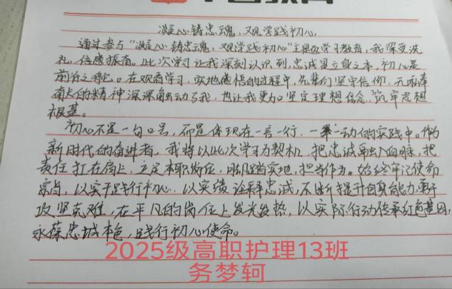 活动以“理论学习+实践创作”为主要形式,扎实开展思想淬炼。同学们自主观看主题教育视频,认真学习党的创新理论、光辉历程与先进典型事迹,深刻感悟党的初心使命与责任担当。在学习基础上,大家结合护理专业特点、校园学习生活和个人思想实际,认真撰写观后感。在学思践悟中深化对党的认识,不断提升政治素养与理论水平。同时,同学们围绕主题教育核心内容精心设计制作宣传海报,以图文结合、创意设计的形式展现学习成果,抒发爱党爱国情怀,让理论学习更加生动鲜活、入脑入心。