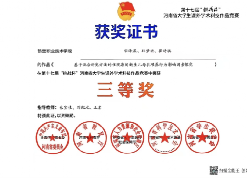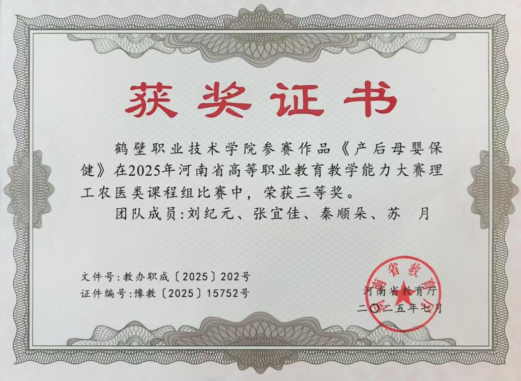 该项目针对高职助产专业传统培养模式中“岗位脱节”“技能单一”等问题,构建了“岗课赛证创”“五位一体”融通育人体系。一是岗位需求导向:联合鹤壁市妇幼保健院等10余家医疗机构,动态调整课程大纲,将助产士核心能力细化为32项教学指标,确保教学内容与临床需求精准对接。二是课程整合优化:开发《助产技能综合实训》等6门模块化课程,融入全国助产技能大赛标准及“1+X”母婴护理证书要求,实现“课证赛”内容互通。教师获得2025年河南省高等职业教育教学能力大赛三等奖。三是技能竞赛驱动:以省级助产技能竞赛为平台,设计“模拟分娩”“产后出血处置”等竞赛场景,学生获得2025年全国“一带一路”暨金砖国家技能发展与技术创新大赛助产技能赛项二等奖。四是证书资质赋能:将“助产士资格证”“母婴护理证”等职业资格培训嵌入教学计划,学生双证获取率达98%,毕业即具备上岗资质。五是创新创业引领:孵化多个学生创业创新项目,获2025年省“挑战杯”一等奖、三等奖各一项。