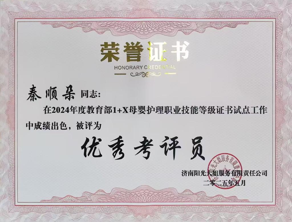 图5:秦顺朵获得教育部1+X母婴护理职业技能等级证书优秀考评员