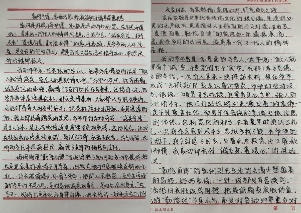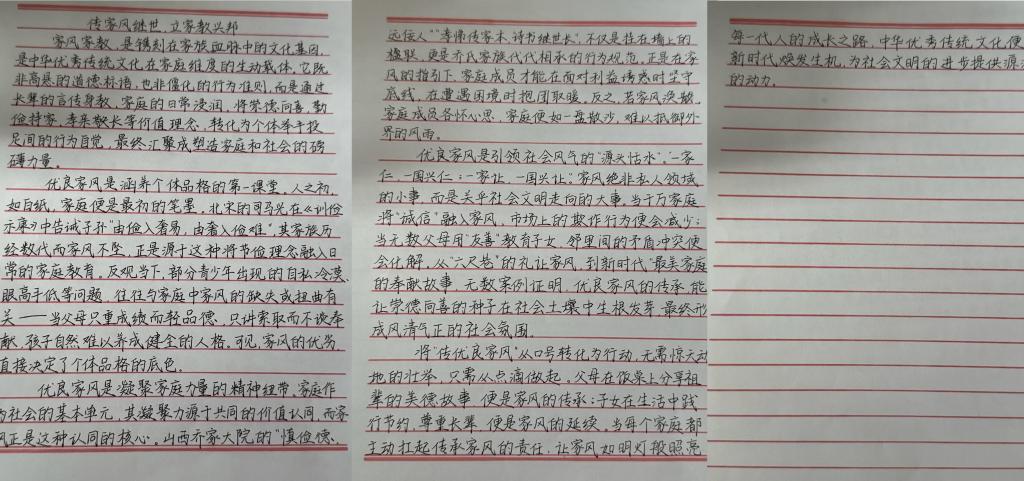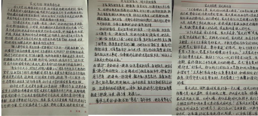 活动期间,同学们踊跃参与,投稿纷至。文章内容真挚动人,既有对家风传承意义的深刻思考,也有围绕尊老爱幼、勤俭持家、和睦邻里等主题的真实故事。他们从自身家庭出发,以细腻笔触讲述家风如何塑造品格、影响行为,并呼吁从“小家庭”做起,以具体行动弘扬美德、传递新风。
