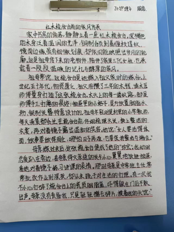 为传承中华优秀传统家庭美德,探寻老物件背后的家风密码,以文字为桥,搭建起连接个人成长、家族记忆与家风传承的精神纽带。2025年11月10日-13日,护理学院举办“老物件·家记忆·好家风”主题征文比赛。