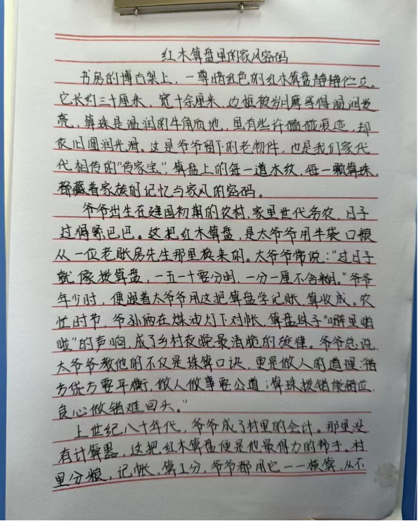 活动中,同学们围绕家中老物件,以细腻笔触勾勒岁月轮廓,书写背后的家族故事与家风传承。字里行间既有对长辈教诲的深切感悟,也有对家族变迁的温情追忆,更有对家风精神的深刻诠释。通过文字,蒙尘的老物件重焕光彩,无形的家风变得可感可触、可传可学。